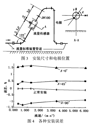 除儀表前直管段可降低彎管影響外,人們還從安裝方式上設(shè)法降低影響的方法。文獻(xiàn)曾報(bào)道電磁流量傳感器電極軸線與鄰近彎管平面成45°傾斜安裝可以減少?gòu)澒苡绊憽H毡竟I(yè)標(biāo)準(zhǔn)B7554“解說(shuō)部分”列有電極軸線與彎管平面垂直、平行、成45°三種安裝方式,在不同長(zhǎng)度直管下的測(cè)量誤差范圍,也說(shuō)明這一效果。
