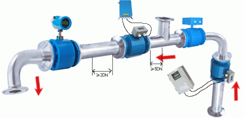 傳感器上游要有一定的直管段,但其長(zhǎng)度與其它流量?jī)x表(如超聲波流量計(jì))相比較要求較低。上游如有90°彎頭、T形管、同心異徑管、全開閘閥等擾流件,一般要求離電極中心線(不是傳感器進(jìn)口斷面)有5倍直徑(5D)長(zhǎng)度的直管段,如是上游有閘閥且沒有全部打開,一般要求10D長(zhǎng)度的直管段;下游直管段長(zhǎng)度一般為2D-3D,或更短;