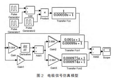 本文基于 Matlab 中 Siumlink 對(duì)電極信號(hào)進(jìn)行仿真,勵(lì)磁方式為三值波勵(lì)磁,勵(lì)磁頻率 f=25Hz,傳感器參數(shù) D=40mm、Rx=88.8Ω、Lx=162mH,勵(lì)磁系統(tǒng)參數(shù) Ue=100V、穩(wěn)態(tài)電流 I0=200mA?;陔姌O測(cè)量回路搭建的仿真模型如圖 2 所示,圖中信號(hào)模塊 pulsGenerator 通過(guò)加法器、乘法器得到勵(lì)磁電流。由公式(1),在固定流速下感應(yīng)電勢(shì)與勵(lì)磁電流成正比,通過(guò)增加 Gain1 模塊得到感應(yīng)電勢(shì)信號(hào)。 對(duì)勵(lì)磁電流進(jìn)行求導(dǎo)即經(jīng)模塊 Derivative 得到微分噪聲, 其中 Gain 值與 Lx 和 L1 相關(guān)。 感應(yīng)電勢(shì)與噪聲經(jīng)Add1 疊加之后得到電極信號(hào) E1(t)。 scope 觀察輸出信號(hào)波形。仿真波形和真實(shí)波形如圖 3 所示。 將傳感器參數(shù)代入到勵(lì)磁電流穩(wěn)態(tài)調(diào)節(jié)時(shí)間公式中,得電流上升時(shí)間為 360μs,測(cè)得實(shí)際上升時(shí)間為 390μs,兩者相差不大,驗(yàn)證了仿真模型的正確性。