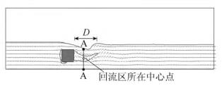 來自上游的水體經(jīng)浮體結(jié)構(gòu)的阻擋作用,水流繞流經(jīng)浮體結(jié)構(gòu)的上部和下部區(qū)域通過,并在浮體結(jié)構(gòu)背水面的下游區(qū)域形成小范圍回流區(qū),此處水流紊亂,流速分布不均勻。試驗(yàn)過程中,對(duì)回流區(qū)沿水流方向的長度D(水槽縱向中心斷面處,自浮體結(jié)構(gòu)背水面到沿水流方向流速為0的*遠(yuǎn)位置點(diǎn))進(jìn)行量測。選取浮體結(jié)構(gòu)下游區(qū)域回流區(qū)中心點(diǎn)所在斷面進(jìn)行流速測量對(duì)比。流速測量斷面位置A-A見圖3。