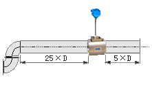 若傳感器安裝點(diǎn)的上游有90°彎并沒有或T形接頭,傳感器上游應(yīng)有不小于20D的等徑直管段,下游應(yīng)有不小于5D的等徑直管段。