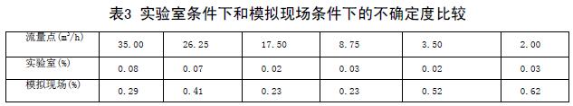 實驗室條件下和模擬現(xiàn)場條件下的不確定度比較(表3)兩次結(jié)果可以看出,兩次實驗各個流量點的不確定度差距非常大??梢?,井水流量計對安裝條件還是比較苛刻的。