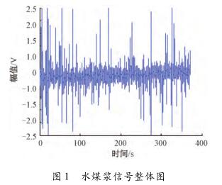 針對(duì)反應(yīng)釜冷水流量計(jì)測(cè)量水煤漿時(shí)出現(xiàn)較大波動(dòng),甚至回零這一問(wèn)題,特去某煤化工企業(yè)甲醇分公司進(jìn)行現(xiàn)場(chǎng)數(shù)據(jù)采集。該公司所使用的對(duì)置式四噴嘴氣化有4個(gè)噴嘴,噴嘴管道口徑為125mm,管中水煤漿流量基本穩(wěn)定在19m³/h(流速約為0.48m/s)。每條噴嘴煤漿線上安裝了3臺(tái)反應(yīng)釜冷水流量計(jì),每臺(tái)反應(yīng)釜冷水流量計(jì)由傳感器和變送器兩部分組成。選擇其中1條水煤漿管線上的1臺(tái)反應(yīng)釜冷水流量計(jì)進(jìn)行數(shù)據(jù)采集,因?yàn)樵撆_(tái)反應(yīng)釜冷水流量計(jì)測(cè)量結(jié)果波動(dòng)大,甚至出現(xiàn)回零的現(xiàn)象。將課題組研制的基于DSP的電磁流量變送器的信號(hào)線和勵(lì)磁線接到該電磁流量傳感器的電極和勵(lì)磁線圈上,組合成完整的反應(yīng)釜冷水流量計(jì),進(jìn)行水煤漿數(shù)據(jù)采集。使用的電磁流量變送器是以TI公司DSP芯片TMS320F28335為核心,采用高頻勵(lì)磁方案,其硬件主要包括勵(lì)磁控制系統(tǒng)和信號(hào)采集處理系統(tǒng),具體的模塊有勵(lì)磁驅(qū)動(dòng)模塊、信號(hào)調(diào)理采集模塊、信號(hào)處理控制模塊、人機(jī)接口模塊、通信模塊及電源管理模塊。信號(hào)調(diào)理采集模塊中的調(diào)理電路對(duì)一次儀表輸出的信號(hào)進(jìn)行放大和濾波,截止頻率是2kHz,放大倍數(shù)約為230倍。通過(guò)NI公司USB-6216型號(hào)的數(shù)據(jù)采集卡進(jìn)行數(shù)據(jù)采集,把調(diào)理電路的輸出端連接到數(shù)據(jù)采集卡的一個(gè)差分輸入端,并設(shè)置數(shù)據(jù)采集卡工作在差分的測(cè)量模式,設(shè)置采集卡的采樣頻率為10kHz。采集多組水煤漿信號(hào)數(shù)據(jù),每組數(shù)據(jù)的時(shí)間長(zhǎng)度為5min。