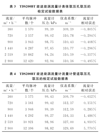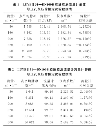 以使用廣泛的DN100B空氣流量計(jì)為例,系統(tǒng)運(yùn)行時(shí)間為60s,標(biāo)準(zhǔn)裝置的滯止平均溫度為28.9℃,空間平均濕度為30%,流量計(jì)的平均溫度為28.3℃,在表體取壓孔取壓和管道取壓孔取壓的流量計(jì)檢定試驗(yàn)數(shù)據(jù)分別如表1、2所示。