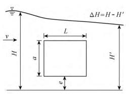 有限水域的浮體結構在不同來流動水中運行時,浮體結構位置的改變會對流場產生影響,從而影響浮體結構的泄流能力以及穩(wěn)定性。試驗過程中固定浮體結構的體型不變(長L=0.20m,寬B=0.30m,高a=0.10m),分別選取4種不同來流流量Q及浮體結構位置e,控制浮體結構在上、下游水位不變的條件下進行試驗,具體試驗參數(shù)設計及說明見表1以及圖2。