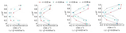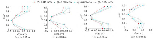 由圖5可知,當e相同時,斷面*小流速發(fā)生的位置相同,發(fā)生在浮體結構下游回流區(qū)位置。隨著來流流量的增大,流經浮體結構下泄的水流流速在上層和下層水體中呈現(xiàn)增大的趨勢。浮體結構位置不變,由于受到浮體結構的擠壓,上游來流分別經過浮體結構上部、下部進行泄流,因此在下游區(qū)域的上層、下層水體中,流速較大;受浮體結構的阻擋,浮體結構下游區(qū)域形成回流區(qū),流速較小。試驗過程中,由于控制浮體結構所在水域的上游、下游水位不發(fā)生變化,因此隨著來流流量的增大,流速呈現(xiàn)增大的趨勢。