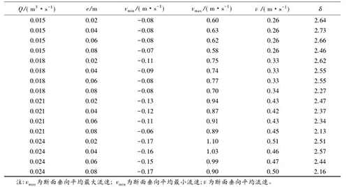 流速沿斷面分布的均勻特性可以通過流速分布不均勻系數(shù)進行表征,通過所選取斷面*大流速和*小流速的差值與該斷面平均流速的比值,δ值越大表明浮體結構的存在對水流斷面流速的分布產生的影響較大。表2中,當來流流量相同時,流速的不均勻系數(shù)多數(shù)隨e的增大而減小。浮體結構位置較小時,主流為浮體結構上部的水流。隨著浮體結構位置的上升,來自上游的水體逐漸分成浮體結構上部和下部的兩股主流,流速分布的不均性減小。浮體結構位置及所處水位條件相同時,來流流量的增大,區(qū)域的平均流速增大,因此流速不均勻性減小。