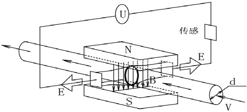 如圖,測量流量時,流體流過垂直于流動方向的磁場,導電性流體的流動感應(yīng)出一個與平均流速成正比的電勢。其感應(yīng)電壓信號通過兩個電極檢出,并通過電纜傳送至轉(zhuǎn)換器,經(jīng)過信號處理及相關(guān)運算后,將累計流量和瞬時流量顯示在轉(zhuǎn)換器的顯示屏上。