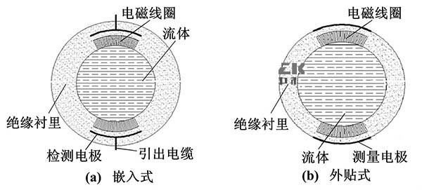 電極與被測(cè)流體通過(guò)絕緣管形成檢測(cè)電容,通過(guò)此電容來(lái)藕合流量信號(hào)。其主要的結(jié)構(gòu)形式按照電極的安裝位置可以分為兩種:電極嵌人測(cè)量管的絕緣襯里內(nèi)部(嵌人式)、電極貼在測(cè)量管外部(外貼式)。嵌入式結(jié)構(gòu)與普通工業(yè)污水流量計(jì)結(jié)構(gòu)相似,而外貼式大多是通過(guò)陶瓷表面金屬化技術(shù)將電極貼在測(cè)量管外。