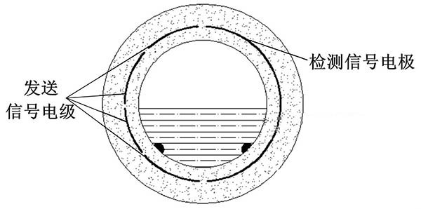 ③利用阻抗或信號(hào)衰減研制的非滿(mǎn)管工業(yè)污水流量計(jì)。這種結(jié)構(gòu)的非滿(mǎn)管工業(yè)污水流量計(jì)是當(dāng)前國(guó)內(nèi)研究的方向之一。其結(jié)構(gòu)是流量管底部貼一對(duì)信號(hào)發(fā)射電極,在流量管中間貼信號(hào)接收電極。由于信號(hào)在流體中傳播會(huì)產(chǎn)生衰減,且傳播時(shí)間越長(zhǎng),衰減越多,因此通過(guò)信號(hào)接收電極接收到的信號(hào)衰減量即可得知液面高度;同時(shí)該電極還能測(cè)量流體切割磁感線(xiàn)產(chǎn)生的電動(dòng)勢(shì),以此達(dá)到測(cè)量非滿(mǎn)管流量的目的。阻抗式或信號(hào)衰減非滿(mǎn)管工業(yè)污水流量計(jì)結(jié)構(gòu)簡(jiǎn)圖如圖5所示。