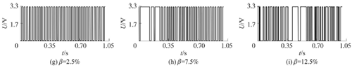 試驗(yàn)發(fā)現(xiàn),氣相的加入對(duì)乙烯流量計(jì)測(cè)量的影響顯著,譜分析和脈沖計(jì)數(shù)兩種方法隨著氣相注入的增加其表現(xiàn)也不同。圖4反映了水流量12m3/h時(shí),注入不同氣含率β時(shí)A點(diǎn)的模擬信號(hào),如圖4(a~c)所示;經(jīng)譜分析后得到的頻率值,如圖4(d~f)所示;用脈沖計(jì)數(shù)方法得到的脈沖信號(hào),如圖4(g~i)所示。圖4顯示,當(dāng)注入氣量不大時(shí),對(duì)乙烯流量計(jì)的影響不大,無(wú)論是譜分析結(jié)果還是脈沖計(jì)數(shù)得到的結(jié)果都比較好。當(dāng)注入的氣量進(jìn)一步增加時(shí),渦街原始信號(hào)強(qiáng)度和穩(wěn)定性逐漸變差,渦街頻率信號(hào)會(huì)被干擾信號(hào)所淹沒,反映到譜分析圖是,渦街頻率的譜能量減小,干擾信號(hào)的譜能量加強(qiáng);對(duì)于脈沖信號(hào),會(huì)因?yàn)橐恍┬郎u信號(hào)減弱,形成脈沖缺失現(xiàn)象,而不能真實(shí)地反映渦街產(chǎn)生的頻率。