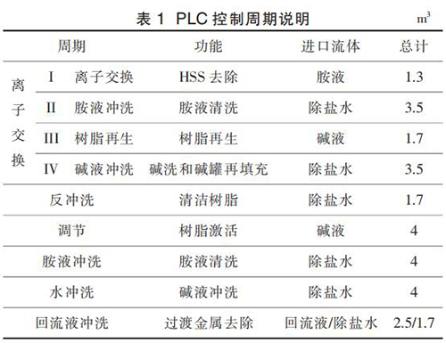 APU 的運行按照事先設(shè)定的程序運行,即嚴(yán)格遵循設(shè)定的步驟順序。 APU 的正確運行依賴于每個步驟的順利完成。 按照預(yù)先設(shè)定好的步驟完成 1 個任務(wù)即視為完成 1 個 APU 運行的“周期”。 離子交換的主周期被稱為“離子交換周期”。除此之外,整個控制程序還包含另外 5 個輔助周期, 分別為反沖洗周期、調(diào)節(jié)周期、胺液沖洗周期、水沖洗周期、回流液沖洗周期。 這 5 個周期在維護和非計劃停車后重新啟動時使用。 PLC 控制各個周期的說明見表 1。