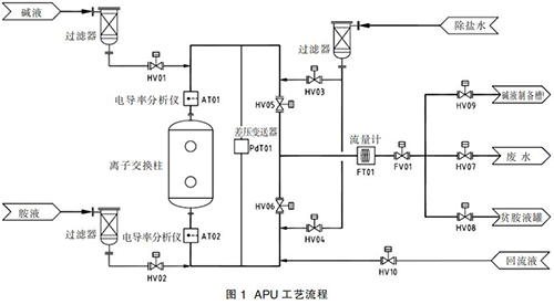 整個 APU 都是通過 PLC 程序自動控制的。程序通過控制閥門的開關(guān)使不同的液體按順序進入離子交換柱,使離子交換柱中的液體按順序排出。