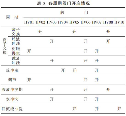 5)回流沖洗周期。 胺液每天都需取樣化驗,如果發(fā)現(xiàn)胺液中有不溶或懸浮的過渡金屬聚集,則每天運行周期結(jié)束后需利用回流液對樹脂進行清洗,以防止腐蝕和樹脂損壞。 如果選擇了此選項,PLC程序會在每天完成目標(biāo)數(shù)量的離子交換周期后,自動執(zhí)行回流液清洗周期。 各周期閥門對應(yīng)開關(guān)情況,如表 2 所示。