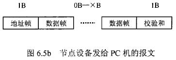 飲用水流量計(jì)等節(jié)點(diǎn)設(shè)備和C機(jī)通信的過程中,由地址幀、命令幀、數(shù)據(jù)幀、校驗(yàn)和可組成各種功能不同的報(bào)文。由于采用主從工作方式來實(shí)現(xiàn)通信,飲用水流量計(jì)等節(jié)點(diǎn)設(shè)備僅能接收并執(zhí)行PC機(jī)發(fā)送來的控制命令,而不能發(fā)送命令給PC機(jī)。因此,由PC機(jī)發(fā)往流量計(jì)等節(jié)點(diǎn)設(shè)備的報(bào)文一般包括一個(gè)地址幀,一個(gè)命令幀,若干個(gè)數(shù)據(jù)幀和一個(gè)校驗(yàn)和,其報(bào)文格式圖.6a5所示;而由流量計(jì)等節(jié)點(diǎn)設(shè)備發(fā)往PC機(jī)的報(bào)文一般包括一個(gè)地址幀,若干個(gè)數(shù)據(jù)幀和一個(gè)校驗(yàn)和,其報(bào)文格式如圖6.5b所示。