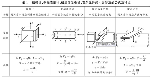易錯點2:磁強計、甲苯流量計、磁流體發(fā)電機、霍爾元件間的區(qū)別與聯(lián)系磁強計、甲苯流量計、磁流體發(fā)電機、霍爾元件都是利用電磁場對帶電粒子的偏轉(zhuǎn)效應(yīng),并且穩(wěn)定時電場力與磁場力均達到平衡。很多學(xué)生容易將其混淆,遇到問題常常搞不清原理,亂代公式,筆者特將4者涉及的公式及特點等做一對比區(qū)別如表1所示。