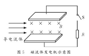 【例1】圖5為磁流體發(fā)電機示意圖。設(shè)兩金屬板間的距離為d,兩極板間勻強磁場的磁感應(yīng)強度為B。等離子體垂直進入磁場的速度為v,單個離子所帶的電荷量為q。離子通道(即兩極板內(nèi)所圍成的空間)的等效電阻為r,負(fù)載電阻為R。則下列判斷正確的是( ?。?br /> A。該發(fā)電機的電動勢E=Bdv