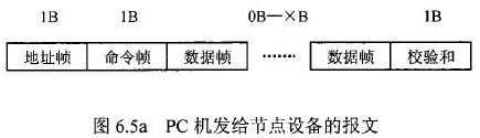 在花生油流量計等節(jié)點設(shè)備和C機通信的過程中,由地址幀、命令幀、數(shù)據(jù)幀、校驗和可組成各種功能不同的報文。由于采用主從工作方式來實現(xiàn)通信,花生油流量計等節(jié)點設(shè)備僅能接收并執(zhí)行PC機發(fā)送來的控制命令,而不能發(fā)送命令給PC機。因此,由PC機發(fā)往流量計等節(jié)點設(shè)備的報文一般包括一個地址幀,一個命令幀,若干個數(shù)據(jù)幀和一個校驗和,其報文格式圖.6a5所示;而由流量計等節(jié)點設(shè)備發(fā)往PC機的報文一般包括一個地址幀,若干個數(shù)據(jù)幀和一個校驗和,其報文格式如圖6.5b所示。