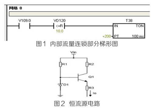 (2)PLC及模塊。PLC及模塊是自動(dòng)化控制系統(tǒng)主要設(shè)備,且PLC及模塊屬于高集成高精密電子設(shè)備,保持室內(nèi)整潔舒適,可以提高自動(dòng)化系統(tǒng)運(yùn)行穩(wěn)定性。PLC及模塊硬件運(yùn)行可靠,內(nèi)部控制程序是其控制核心軟件,如PLC硬件出現(xiàn)故障或損壞一般直接更換,但原內(nèi)部控制軟件無法上傳,整個(gè)控制系統(tǒng)成失控狀態(tài)。所以其內(nèi)部控制程序在調(diào)試驗(yàn)收合格后應(yīng)及時(shí)備份并做好標(biāo)記,為以后修復(fù)PLC故障提供保障。PLC系統(tǒng)的維護(hù)技術(shù)人員需掌握一定基礎(chǔ)PLC控制邏輯原理,對(duì)準(zhǔn)確判斷PLC故障點(diǎn)有很大的幫助。例如選礦廠水泵房S7-200系列PLC自動(dòng)抽水系統(tǒng)出現(xiàn)如下故障 :觸摸屏能控制變頻器啟動(dòng)水泵抽水,但在短時(shí)間內(nèi)會(huì)自動(dòng)停泵,導(dǎo)致無法正常抽水。通過故障現(xiàn)象可初步判斷PLC及模塊硬件設(shè)備正常,主要由于某個(gè)變量有問題導(dǎo)致連鎖停機(jī)。打開備份PLC控制梯形圖程序進(jìn)行相關(guān)分析,原來是高溫液體流量計(jì)瞬時(shí)流量數(shù)值做了連鎖,其在一定時(shí)間內(nèi)瞬時(shí)流量不大于10m 3 /h時(shí),自動(dòng)停泵,電磁流量模擬量輸出電流值僅為4ma且無變化,確定高溫液體流量計(jì)有故障??膳R時(shí)應(yīng)急維修,模擬量模塊輸入模擬電流值10ma~20ma之間一固定數(shù)值即可恢復(fù)正常運(yùn)行。制作簡單恒流源電路代替高溫液體流量計(jì)輸出的模擬電流量,實(shí)現(xiàn)解決水泵無法正常運(yùn)行的故障。