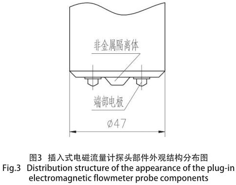 通過(guò)大量的試驗(yàn),對(duì)探頭端部外型結(jié)構(gòu)亦采用特殊設(shè)計(jì),從而消除兩個(gè)電極之間的擾流現(xiàn)象,同時(shí)亦消除因通電產(chǎn)生磁場(chǎng),導(dǎo)致兩個(gè)電極吸附介質(zhì)中的鐵屑而影響測(cè)量精度和死區(qū)效應(yīng),增強(qiáng)了輸出信號(hào)的穩(wěn)定性,從而提高傳感器準(zhǔn)確度和抗干擾性。通過(guò)結(jié)構(gòu)的優(yōu)化設(shè)計(jì),使用壽命更長(zhǎng),煤層注水流量計(jì)探頭局部,如圖 3 所示。