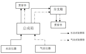 安全殼高溫蒸汽流量計(jì)以總成箱和分支箱為核心。試驗(yàn)初期,將總成箱置于儀器放置區(qū),分支箱置于貫穿件集中區(qū)域附近,檢漏儀至總成箱再至分支箱之間的管線固定連接,如圖2所示。水法試驗(yàn)管路與氣法試驗(yàn)管路互相獨(dú)立,總成箱和分支箱的每一路連接采用編號(hào)標(biāo)記進(jìn)行區(qū)分,并設(shè)置控制閥控制開關(guān)和流向。