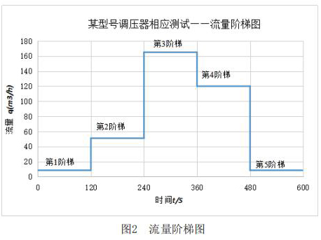 該測試主要利用實驗室測試條件,模擬客戶現(xiàn)場使用情況。其主要測試內(nèi)容包括:測試高溫液體流量計在+23℃,-30℃和-40℃三種溫度下,高溫液體流量計出口壓力分別在2.1kPa和30kPa時,流量分別從*1階梯到*5階梯時的響應速度,客戶所提供的流量階梯如圖2所示。橫軸表示下游球閥開啟動作時間,縱軸表示高溫液體流量計下游需要的流量q。