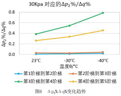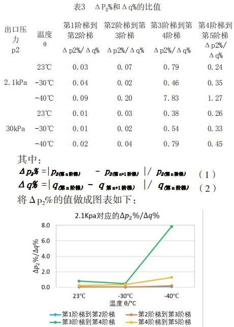 為了更直觀嚴謹?shù)膶Ρ让總€階段響應速度的不同,對原始數(shù)據(jù)進行處理,得到如下表格2和表格3。將△p2%/△q%作為響應速度的直觀量化表達,若△p2%/△q%的值大,說明單位流量變化照成的出口壓力變化大,即說明高溫液體流量計響應相對較慢,反之亦然。