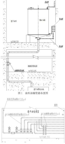 透平油油庫及油處理室設置在發(fā)電機出線層。油庫中安裝4個油桶,單個油桶容積為25m3。按照功能劃分為2個運行油桶,2個凈油桶。每個油桶ding部設置一根油桶進油管,油桶下部設置一根給機組供油管,油桶底部設置一根事故排油管,經(jīng)事故排油閥引入事故油池中,事故排油管上引出一根油桶排油管。各油桶的進油管、供油管、排油管分別引入油處理室中。具體布置形式可見圖1所示。油處理室中設置一個容積為1m3的移動油箱,用于向設備添油或臨時儲油。