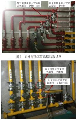 (1)改造后,各個油桶的油處理工作實現(xiàn)互不影響的效果。油桶排油支管的臨時接口兩端的球閥都是近油桶側的閥門,油桶進油支管的臨時接口ding部的球閥為近油桶側的閥門。油桶需進行油過濾工作時,僅需將濾油機的進油管接在該油桶排油支管新增的臨時接口上,同時濾油機的出油管連接在該油桶進油支管新增的臨時接口上,然后分別打開進油支管和排油支管新增臨時接口ding部的近油桶側球閥,即可開始形成循環(huán)油路進行油桶內的透平油過濾。同時未改變各個油桶中透平油的互相倒換、轉移功能。