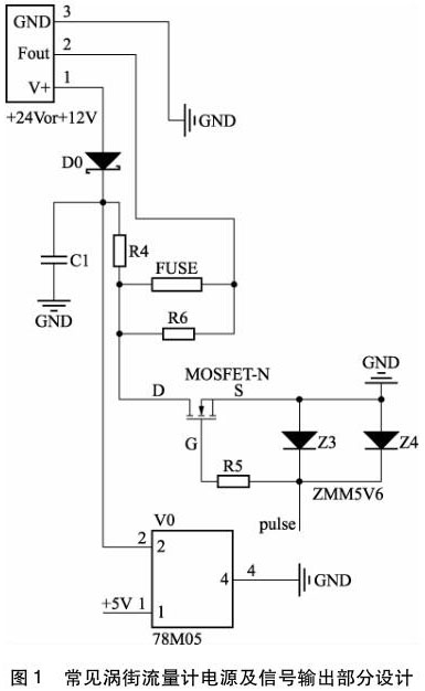 從圖1 中可以看到,供電電源 +24 V, +12 V均可,直流電源通過(guò)瓷片電容 C1 濾掉部分紋波,然后通過(guò)線性穩(wěn)壓芯片 78M05,得到 + 5 V 電壓,為后面的流量計(jì)信號(hào)處理電路供電,若要再得到 3. 3 V 電壓,通常會(huì)在 78M05 后再加一片線性穩(wěn)壓芯片 LM1117-3. 3,為了節(jié)約成本,供電電路沒(méi)有做 EMS 設(shè)計(jì)。同時(shí),脈沖輸出部分,僅通過(guò)一個(gè) MOS 管和兩個(gè)穩(wěn)壓管,也沒(méi)有 EMS 方面的設(shè)計(jì)考慮。