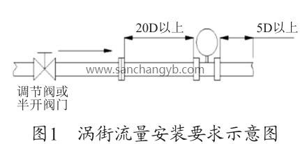 根據(jù)圖1渦街流量安裝要求示意圖及廠家的設(shè)備說明書要求,流量計(jì)上游的直管段長度至少為20D≈1 600mm,下游的直管段至少在5D≈400mm,D=80mm 為管道直徑。圖2為現(xiàn)場安裝圖,流量計(jì)上游僅為600mm <1 600mm,此流量計(jì)安裝位置有誤,對(duì)測量值有一定的影響,造成測量偏差,需調(diào)整流量計(jì)的安裝位置。