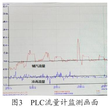 通過圖3可以看出,PLC 上輔汽測量用的脫硫煙氣流量計(jì)的量程設(shè)置為30t/h,現(xiàn)場設(shè)備量程實(shí)際為5t/h,兩者嚴(yán)重不符,因此測量值8.286t/h 為錯(cuò)誤值,需要對(duì)程序進(jìn)行修改。