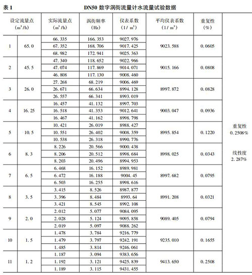 將本文實現(xiàn)的數(shù)字鍋爐煙氣流量計在上述 50mm 口 徑( 簡稱 DN50) 的水流量試驗裝置上進(jìn)行試驗。先在其正常流量范圍內(nèi)進(jìn)行試驗,流量從大到小逐漸降低,之后不斷探求其所能測量的*小流量。每個流量點試驗三次,計算其重復(fù)性、平均儀表系數(shù)和線性度。水流量試驗數(shù)據(jù)如表 1 所示。