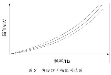 其中 c 為系數(shù), δ 為相對(duì)誤差限, 其示意圖如圖 2 所示,圖中實(shí)線為幅頻關(guān)系的理論擬合曲線, 而虛線為幅值波動(dòng)的閾值曲線。根據(jù)實(shí)驗(yàn)的數(shù)據(jù),渦街信號(hào)幅值波動(dòng)的相對(duì)誤差為 ±10% 。