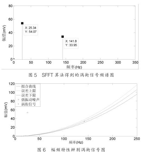從圖 5 可以看出 SFT 算法能夠很好恢復(fù),對(duì)渦街信號(hào)的頻率恢復(fù)沒(méi)有誤差,而幅值的誤差不超過(guò) 1% ,這對(duì)含有強(qiáng)振動(dòng)噪聲的渦街信號(hào)精確測(cè)量至關(guān)重要;圖 6 是經(jīng) SFT 頻譜分析所得到的數(shù)據(jù)通過(guò)幅頻特性曲線來(lái)辨別是噪聲信號(hào)還是渦街信號(hào)。通過(guò)幅頻關(guān)系的信號(hào)處理方法可以從含有振動(dòng)的混合信號(hào)中識(shí)別渦街信號(hào),從而達(dá)到提高液化氣流量計(jì)抗振動(dòng)性能的目的。