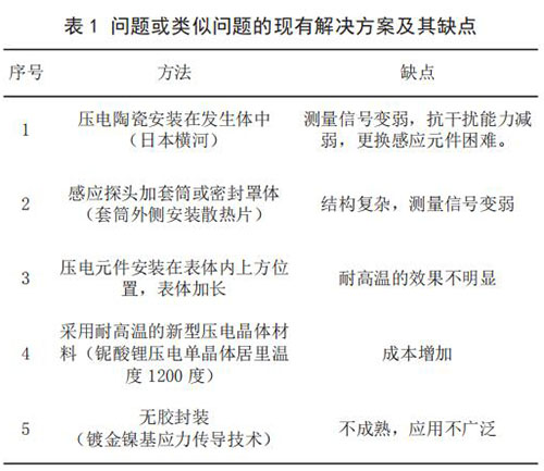 3) 當(dāng)前技術(shù)系統(tǒng)存在的問題。 由于目前使用的傳感器檢測(cè)感應(yīng)元件為壓電陶瓷,其極化時(shí)居里溫度大約420 ~ 460℃,因此只能在低于 240℃介質(zhì)中使用,一旦被測(cè)量介質(zhì)的溫度高于 240℃,液態(tài)液化氣流量計(jì)傳感器便會(huì)因壓電陶瓷達(dá)到居里點(diǎn),絕緣電阻降低,壓電信號(hào)變?nèi)醵А?br /> 4)問題或類似問題的現(xiàn)有解決方案及其缺點(diǎn)(見表 1)。