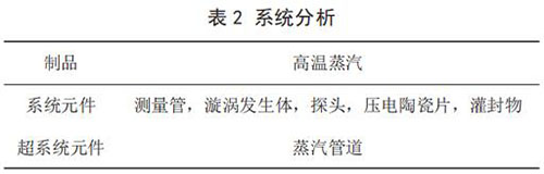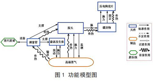 建立已有系統(tǒng)的功能模型(見圖 1)。通過功能模型分析,描述了系統(tǒng)元件及其之間的相互關(guān)系,并得出導(dǎo)致傳感器耐受溫度不足問題的功能因素:高溫蒸氣對(duì)測(cè)量管傳熱;測(cè)量管對(duì)探頭傳熱;探頭對(duì)灌封物傳熱;灌封物對(duì)壓電陶瓷片傳熱;高溫蒸氣對(duì)探頭傳熱。