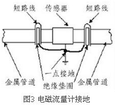 (4)盡量避開振動源、磁源(大功率電機、變壓器)由于流量計的測量感應(yīng)電壓很小,電壓較低,易受外界電磁噪聲的影響,故在安裝時應(yīng)進行可靠的接地連(跨)接。金屬管道流量計接地連(跨)接方法如圖3所示