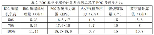 為維持 BOG 系統(tǒng)壓力穩(wěn)定,在正常工況下通過(guò) BOG壓縮機(jī)回收 BOG 方式進(jìn)行,在檢修期間采用火炬放空方式進(jìn)行。從表 2 中可以看出,在系統(tǒng)壓力維持一定值時(shí),理論計(jì)算值與 BOG 壓縮機(jī)處理量基本相同,火炬氣放空量 計(jì)算方法可行。