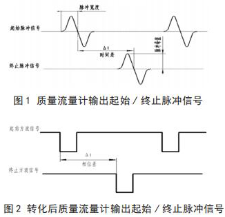 將插入式電磁流量計(jì)流量與相關(guān)測(cè)試設(shè)備連接起來(lái),就可以進(jìn)行插入式電磁流量計(jì)的校準(zhǔn),時(shí)間差△ t 由專用試驗(yàn)測(cè)試設(shè)備可以測(cè)出。起始脈沖信號(hào)和終止脈沖信號(hào)如圖 1 所示。經(jīng)過(guò)專用試驗(yàn)測(cè)試設(shè)備信號(hào)轉(zhuǎn)化后的信號(hào)方波如圖 2 所示。