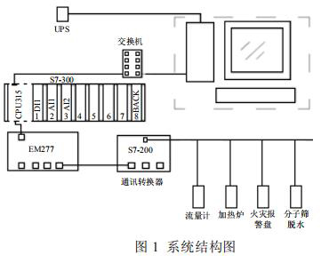 集氣站是收集氣井所生產(chǎn)天然氣的站場(chǎng),在集氣站內(nèi)對(duì)天然氣進(jìn)行節(jié)流降壓、加熱、調(diào)壓計(jì)量等各種工藝預(yù)處理,設(shè)備眾多且分散。為方便進(jìn)行檢測(cè)和操作,必須進(jìn)行統(tǒng)一的數(shù)據(jù)采集,在監(jiān)控臺(tái)進(jìn)行數(shù)據(jù)的管理。集氣站設(shè)備主要包括加熱爐、衛(wèi)生型渦輪流量計(jì)、分子篩、火災(zāi)報(bào)警盤,以及供電設(shè)備 UPS 等,這些不同廠家的設(shè)備基本都支持Modbus 協(xié)議,通過(guò) Modbus 通訊可以將這些數(shù)據(jù)采集。為了有效降低成本,設(shè)計(jì)了如圖 1 所示的系統(tǒng)。系統(tǒng)采用西門子 S7-300 控制器,通過(guò)以太網(wǎng)連接上位機(jī)監(jiān)控軟件,再通過(guò) MP277 連接S7-200 的方式。S7-200 控制器自帶 RS485 接口,能夠進(jìn)行 Modbus 通訊,采集現(xiàn)場(chǎng)各種設(shè)備數(shù)據(jù)。*后通過(guò)以太網(wǎng)通訊將設(shè)備數(shù)據(jù)上傳至監(jiān)控軟件,方便操作人員進(jìn)行監(jiān)控,該方案簡(jiǎn)單有效,能夠?qū)崿F(xiàn)集氣站內(nèi)設(shè)備的狀態(tài)監(jiān)控,數(shù)據(jù)處理,有效的進(jìn)行天然氣的生產(chǎn)工作。
