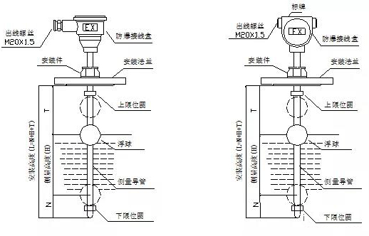 2、安裝前需確認(rèn)被測(cè)液體內(nèi)及液位計(jì)周?chē)粦?yīng)有鐵磁性雜質(zhì),且介質(zhì)比重應(yīng)大于浮球的比重,否則會(huì)影響液位計(jì)正常工作。