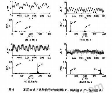 為了觀測管道周期振動下渦街流量信號的特征,利用NI USB-6009數(shù)據(jù)采集卡對渦街正弦信號進(jìn)行采樣。以垂直方向管道振動加速度為0.1g為例,給出了不同流速下渦街信號的時頻域圖,如圖4所示。由時域部分可知,管道振動下渦街流量傳感器輸出的信號為真實旋渦脫落信號和管道振動信號的合成信號。低流速(≤1lm/s)時,管道振動信號強(qiáng)、占主要成分,渦街信號疊加在其上;隨著流速變大(11~20.5m/s),渦街信號逐漸顯露出來成為主要成分、淹沒振動信號。由頻域可知,振動信號成分較單一,呈尖峰狀,幅值為定值,不隨流速變化而變,除40Hz基頻外還有2、3倍頻出現(xiàn);而渦街信號成分稍復(fù)雜,呈塔峰狀,幅值隨流速變大而迅速增強(qiáng),頻譜能量占總能量比重也隨流速增加而變大。