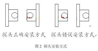d.探頭安裝時要注意方向。該廠流量計一度頻頻歸零,起先找了很多原因,如給流量計井做防水,更換耦合劑等,但是效果并沒有大的改善。結(jié)果是雖然頻頻更換耦合劑,但二次表中信號強(qiáng)度*好僅能達(dá)到44dB,且信號強(qiáng)度不穩(wěn)定,浮動較大,導(dǎo)致流量不夠準(zhǔn)確。有時甚至涂抹一次耦合劑只能正常顯示數(shù)據(jù)一天時間。后來發(fā)現(xiàn)一個探頭在兩根鋼帶內(nèi)側(cè),另一個探頭在兩根鋼帶外側(cè),而兩個探頭應(yīng)該同在兩根鋼帶內(nèi)側(cè),如圖2所示。錯誤安裝方式的結(jié)果是聲波信號接收效果不好。將安裝方式更改之后,信號強(qiáng)度*好能達(dá)到70dB,并穩(wěn)定在60-70dB之間,從而保證了流量數(shù)據(jù)的準(zhǔn)確性。